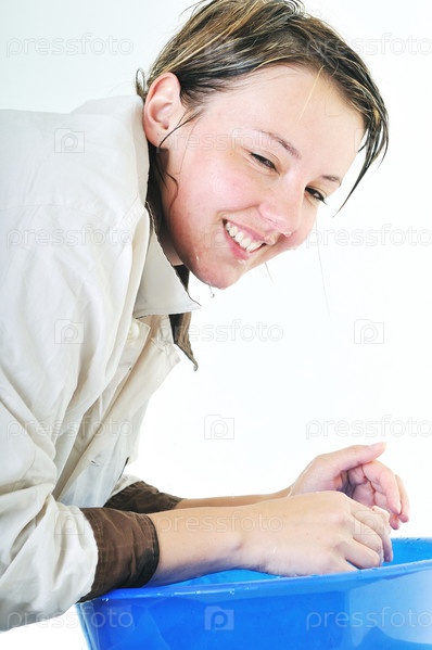 Молодая женщина умывается чистой водой, изолировано на белом фоне