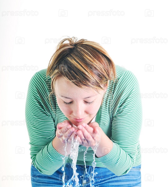 Молодая женщина умывается чистой водой, изолировано на белом фоне