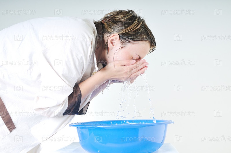 Молодая женщина умывается чистой водой, изолировано на белом фоне