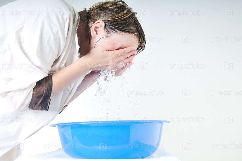 Молодая женщина умывается чистой водой, изолировано на белом фоне