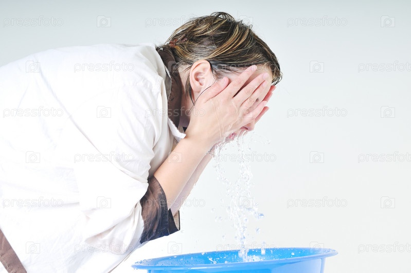 Молодая женщина умывается чистой водой, изолировано на белом фоне