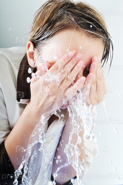 Молодая женщина умывается чистой водой, изолировано на белом фоне