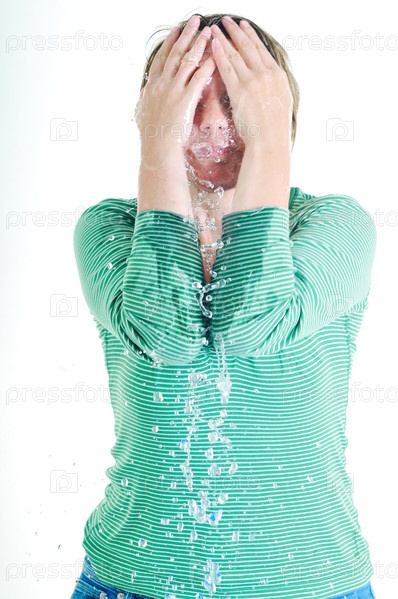 Молодая женщина умывается чистой водой, изолировано на белом фоне