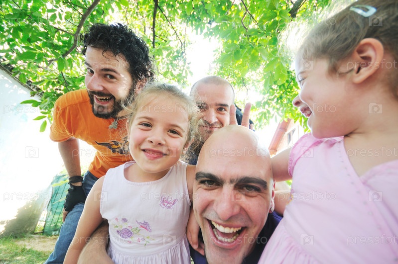 Молодые люди с девочками-близнецами на открытом воздухе