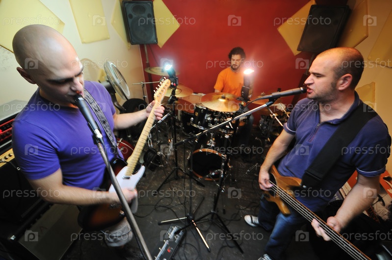 Молодой музыкант со своей группой репетирует в гараже