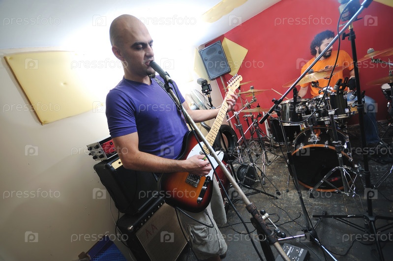 Молодой музыкант со своей группой репетирует в гараже