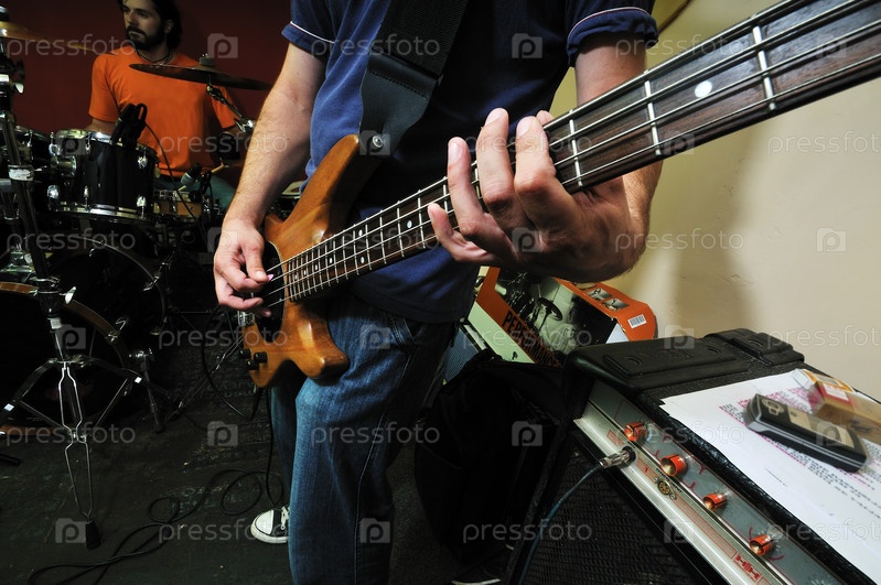 Молодой музыкант со своей группой репетирует в гараже