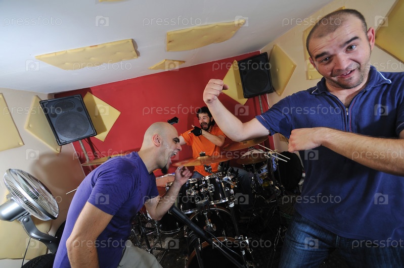 Молодой музыкант со своей группой репетирует в гараже