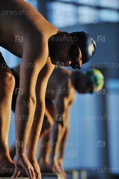 Пловцы на старте в бассейне