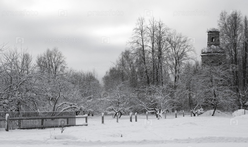 Старая колокольня и сад зимой в деревне Ефремово, Смоленской области