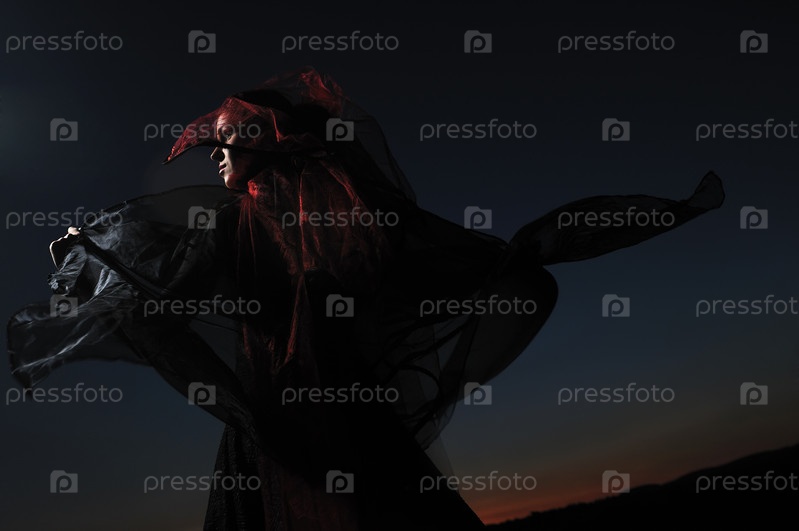 Молодая красивая невеста в черном свадебном платье, ночь