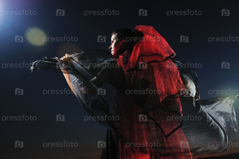 Молодая красивая невеста в черном свадебном платье, ночь