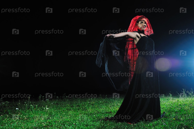 Молодая красивая невеста в черном платье, ночь