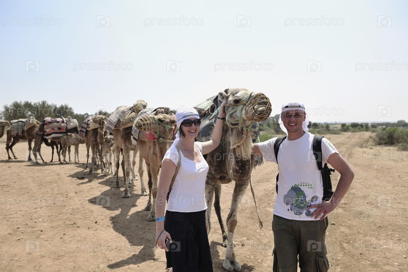 Мужчина и женщина с верблюдом в пустыне