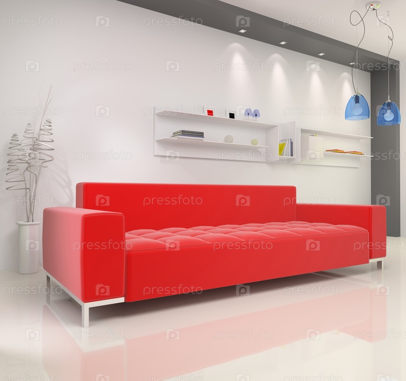 Интерьер комнаты с ярким красным диваном
