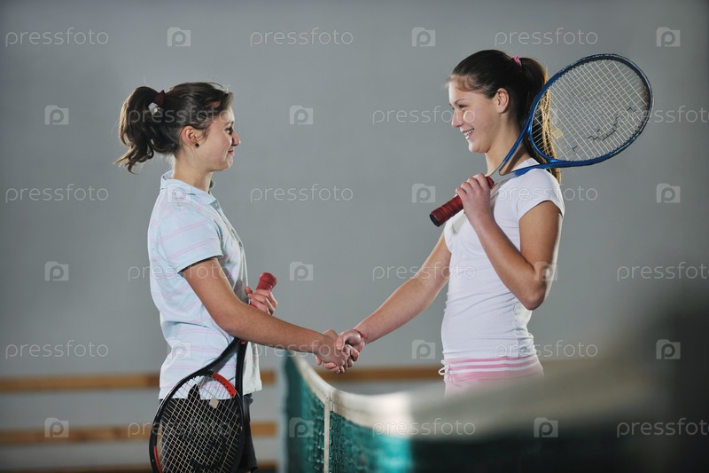 Две девушки с теннисными ракетками у сетки