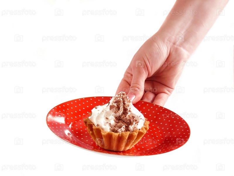 Пирожное на красной тарелке на белом фоне