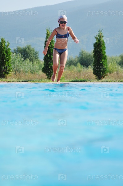Девочка собирается прыгнуть в бассейн