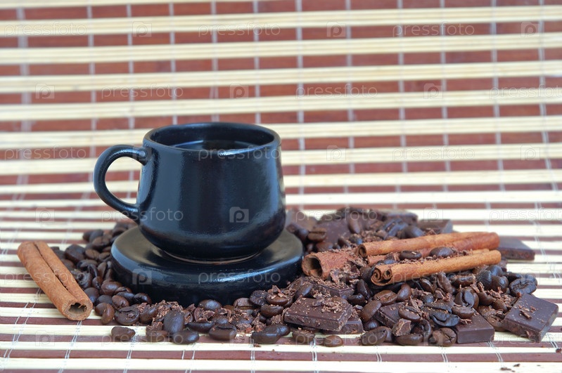 Чашка кофе, кофейные зерна, корица и шоколад на фоне бамбуковой салфетки