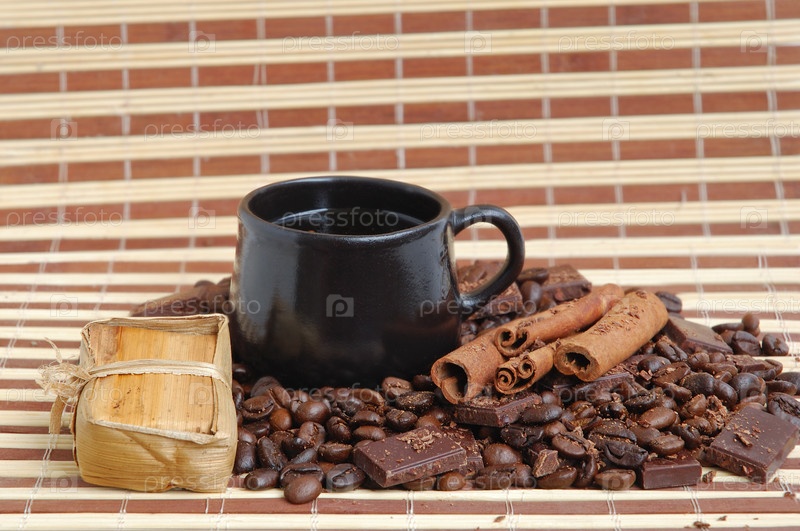 Чашка кофе, кофейные зерна, корица и шоколад на фоне бамбуковой салфетки