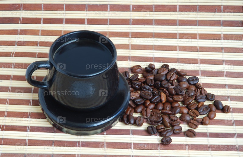 Черная чашка кофе и кофейные зерна на бамбуковой салфетке