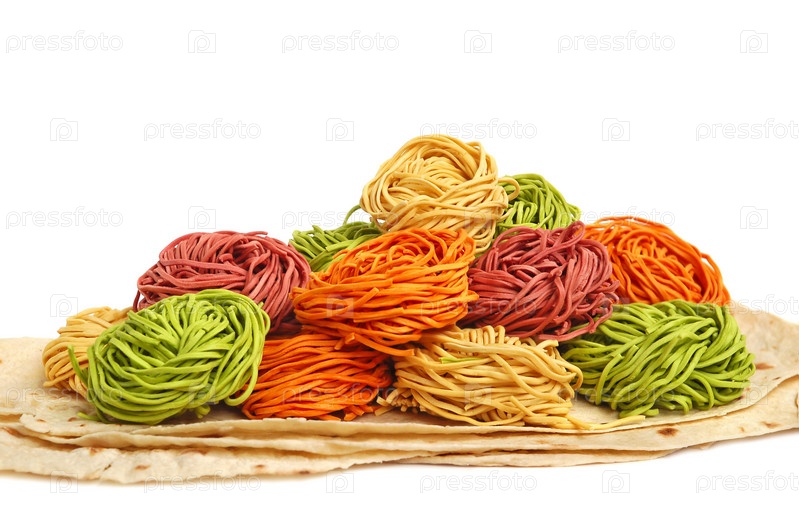 Разноцветные итальянские макароны тальятелле на белом фоне