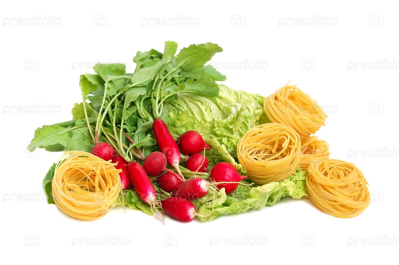 Итальянские макароны тальятелле, редис и листья салата на белом фоне