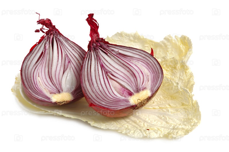 Лук и листья салата на белом фоне