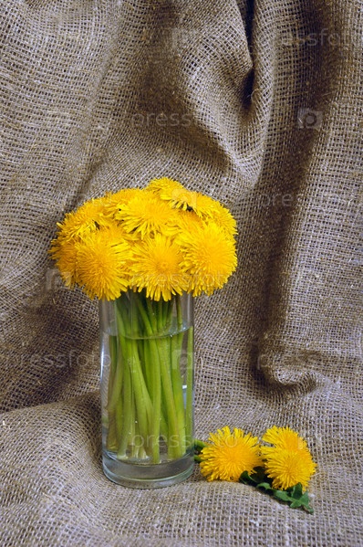 Букет из одуванчиков в стеклянной вазе на фоне холста