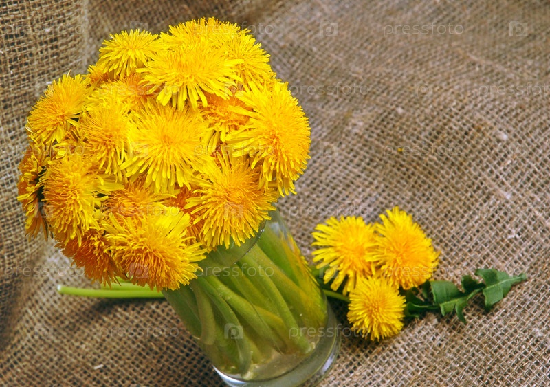 Букет из одуванчиков в стеклянной вазе на фоне холста