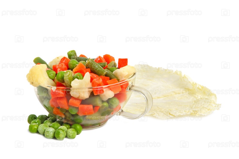 Свежие овощи в стеклянной посуде на белом фоне