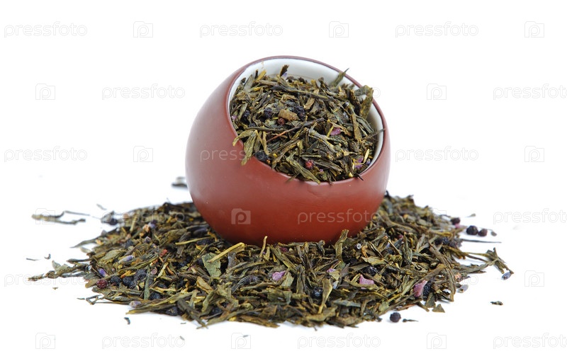 Чашка с сушеными листьями зеленого чая на белом фоне