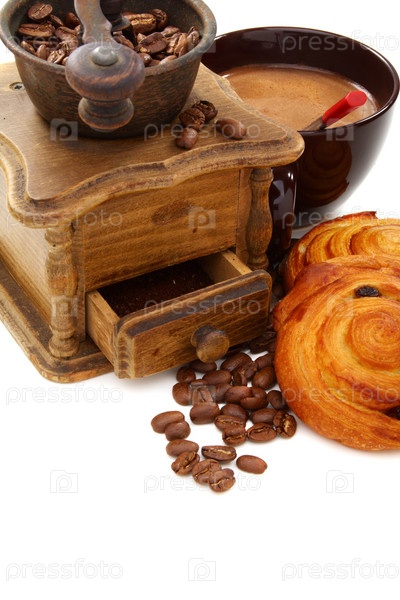 Кофемолка с зернами кофе, булочки и чашка кофе на белом фоне