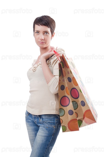 Девушка с покупками стоит на белом фоне