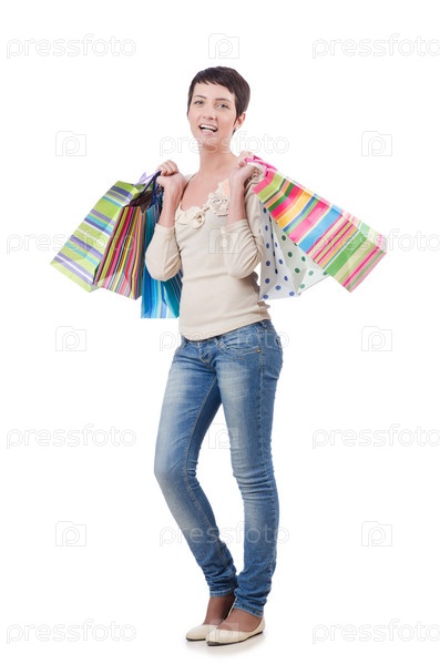 Девушка с покупками стоит на белом фоне