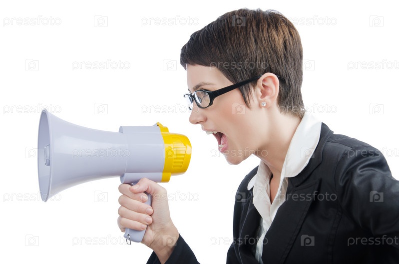 Молодая бизнес-леди кричит в громкоговоритель на белом фоне