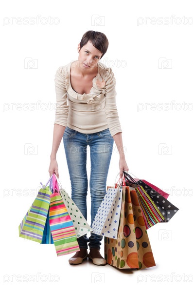 Уставшая девушка с покупками стоит на белом фоне