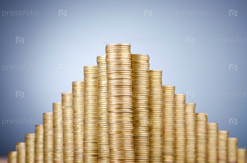 Пирамида из монет на голубом фоне