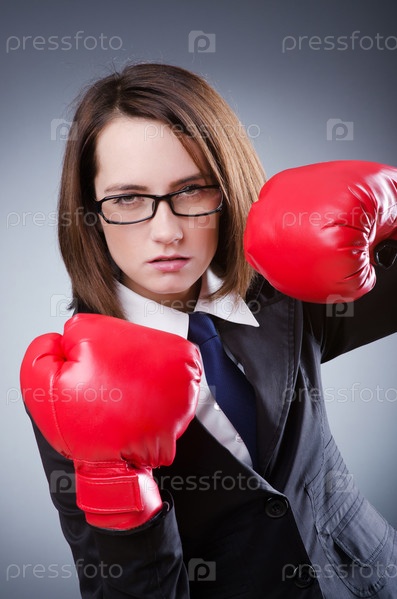 Молодая деловая женщина в красных боксерских перчатках на сером фоне