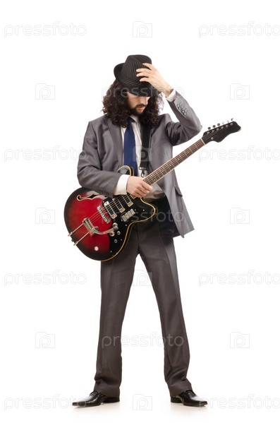 Молодой гитарист на белом фоне