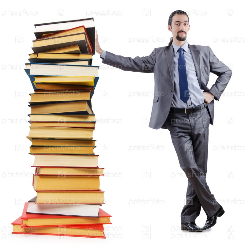 Предприниматель со стопкой книг на белом фоне