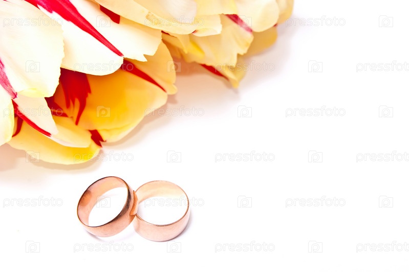 Желто-красные тюльпаны и два обручальных кольца на белом фоне