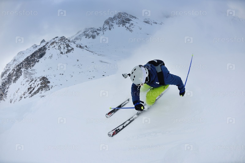 Молодой человек катается на горных лыжах