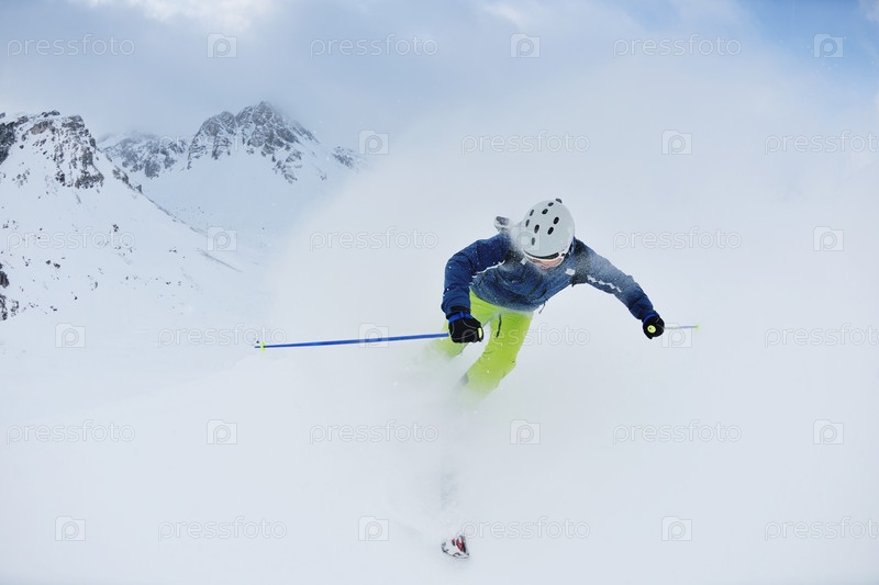 Молодой человек катается на горных лыжах