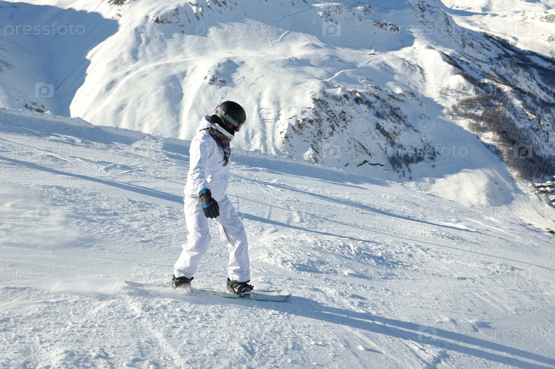 Сноубордист на склоне горы, солнечный день