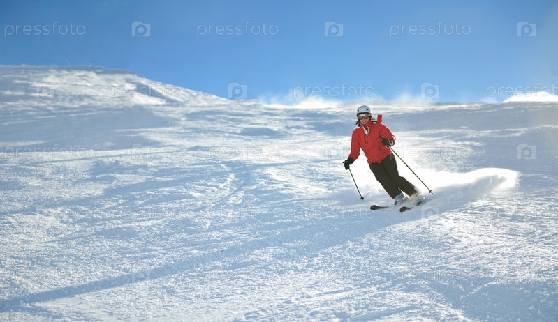 Лыжник на склоне горы, солнечный день