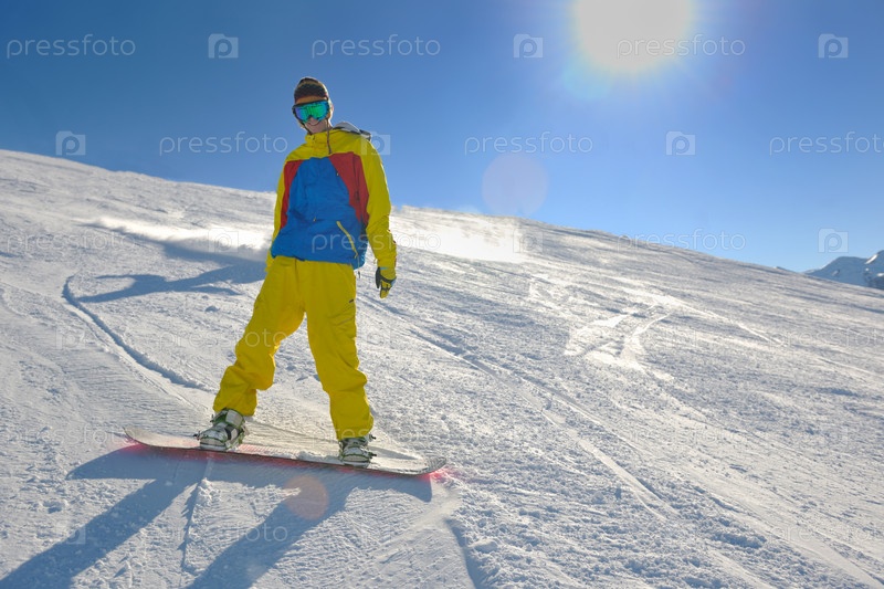Сноубордист на склоне горы, солнечный день