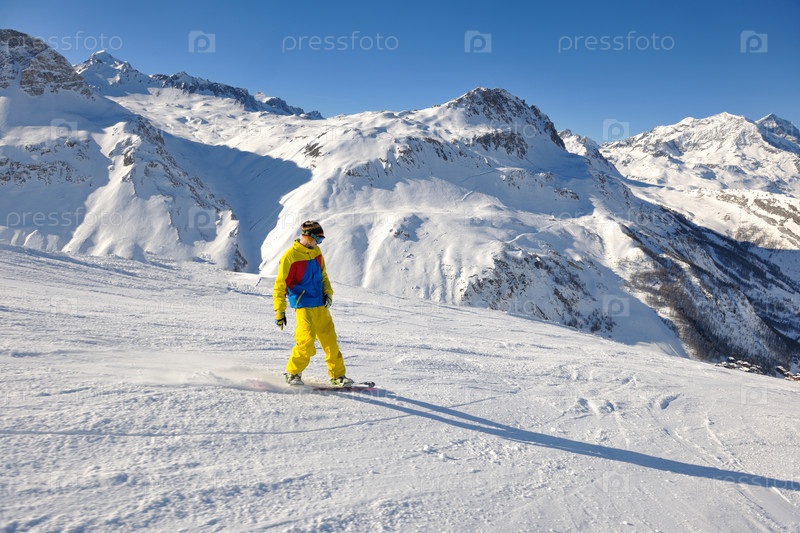 Сноубордист на склоне горы, солнечный день