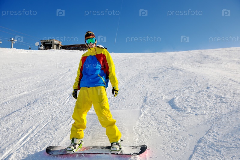 Молодой человек катается на сноуборде