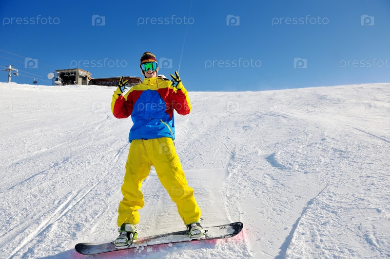 Молодой человек катается на сноуборде